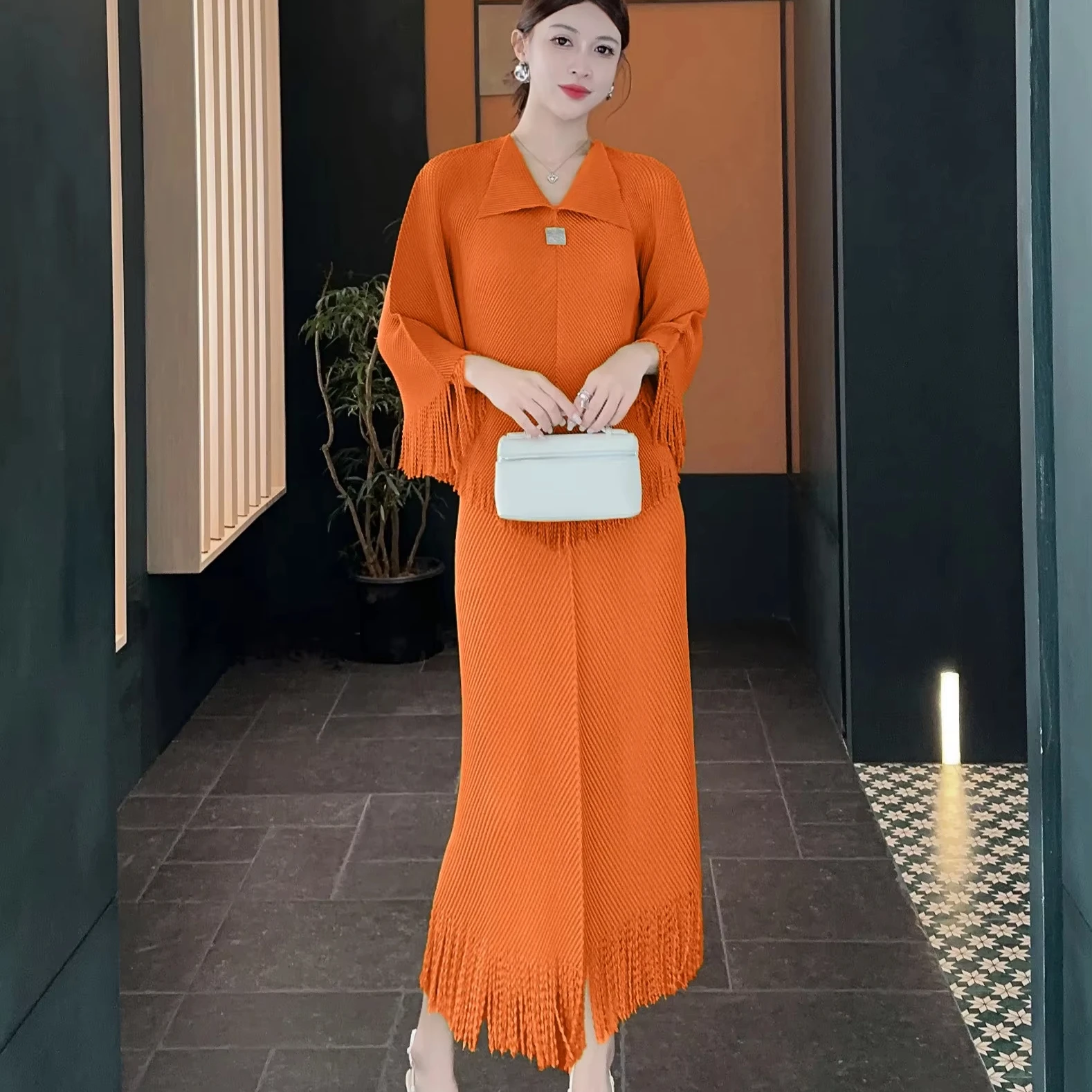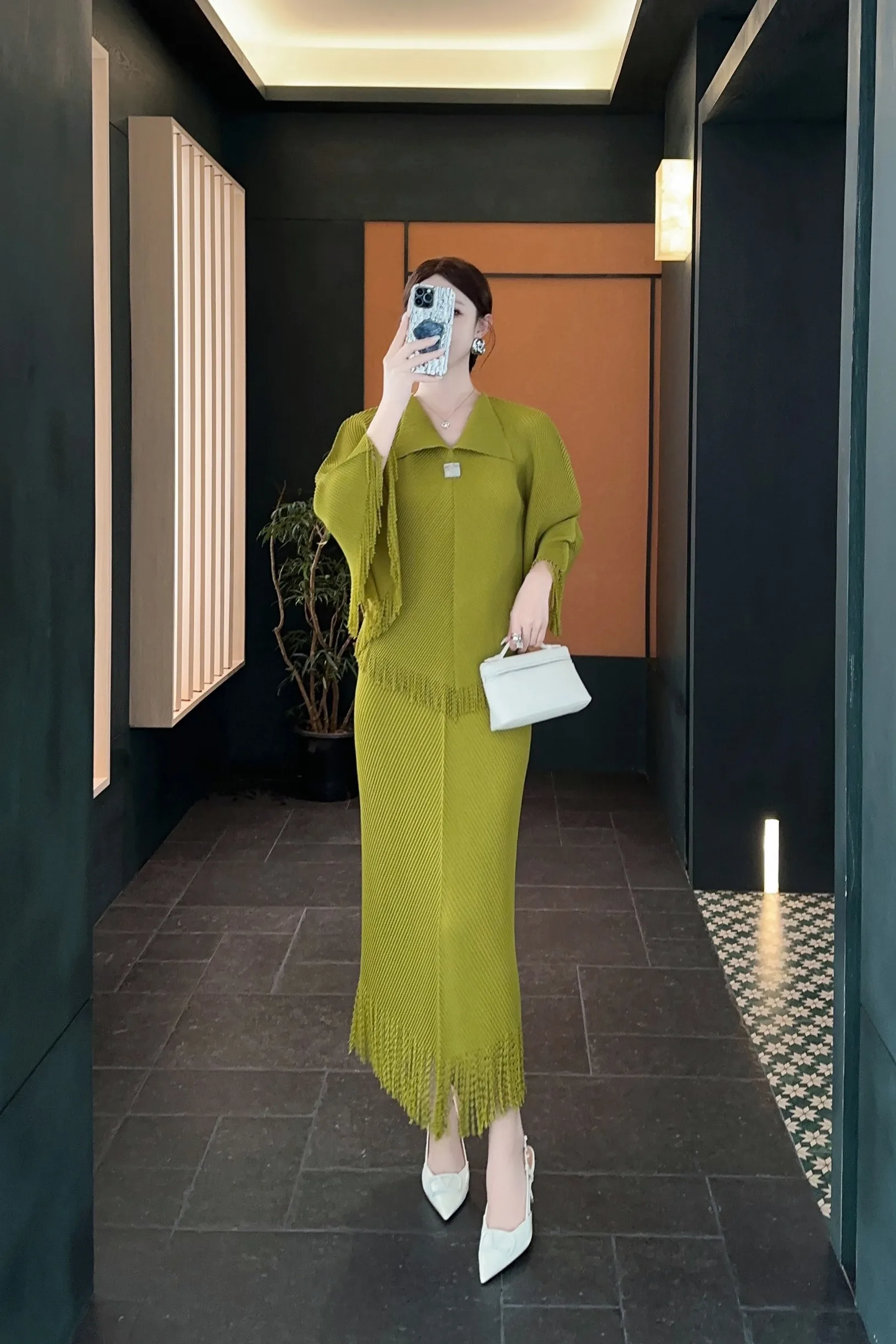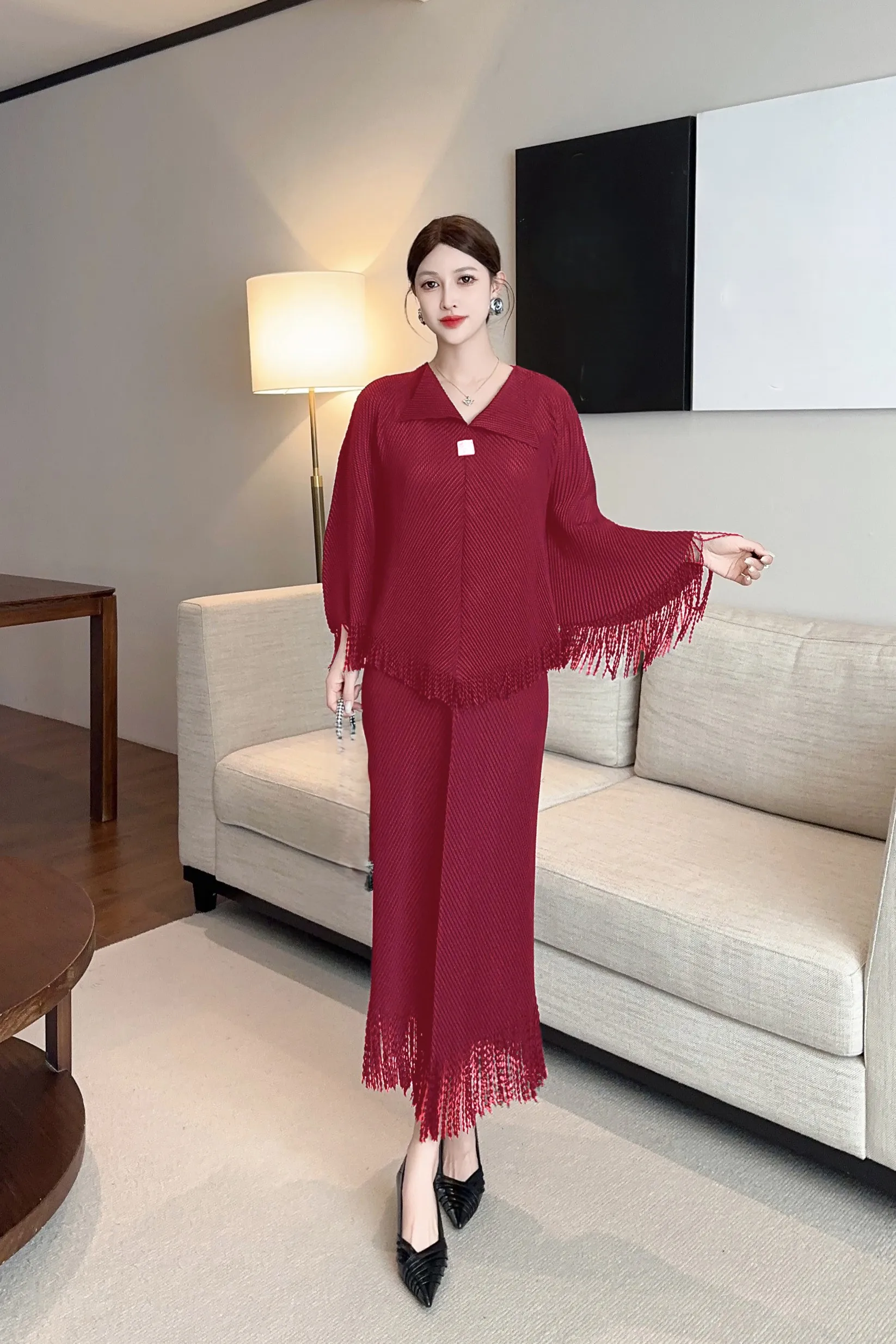 High-quality Women's Pleated Suit in Solid Color with Elegant Fringes - Large Size Women's Suit